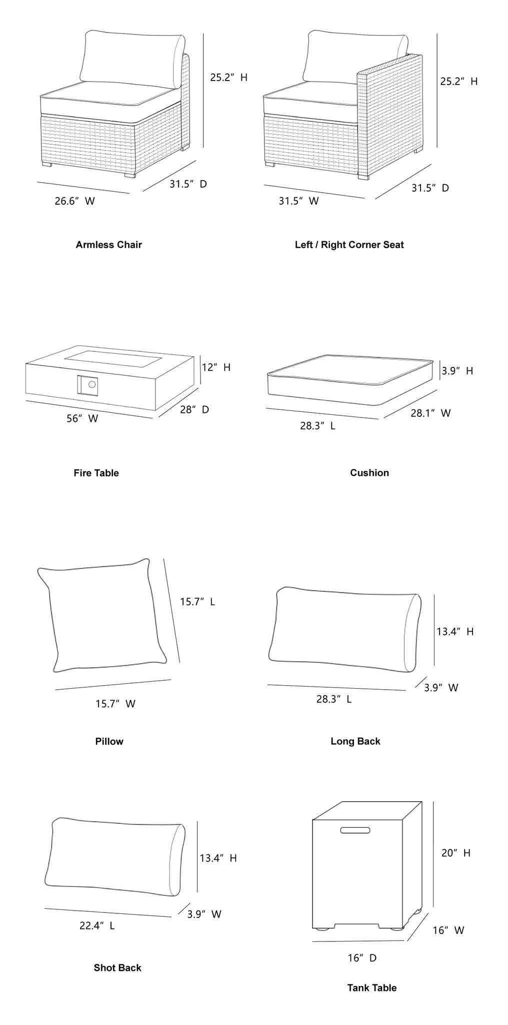 | Side Cushion(in.) | 22.4″L × 3.9″W × 13.4″H | Tank Table(in.) | 15.7″ D × 15.7″ W × 20.4″ H |