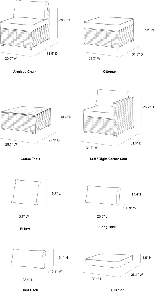 | Side Cushion(in.) | 22.4″L × 3.9″W × 13.4″H | Coffee Table(in.) | 26.6″ D × 26.6″ W × 13.6″ H |