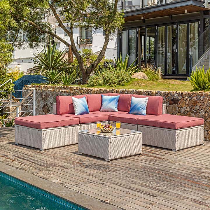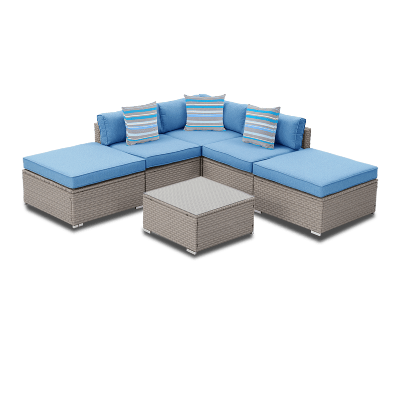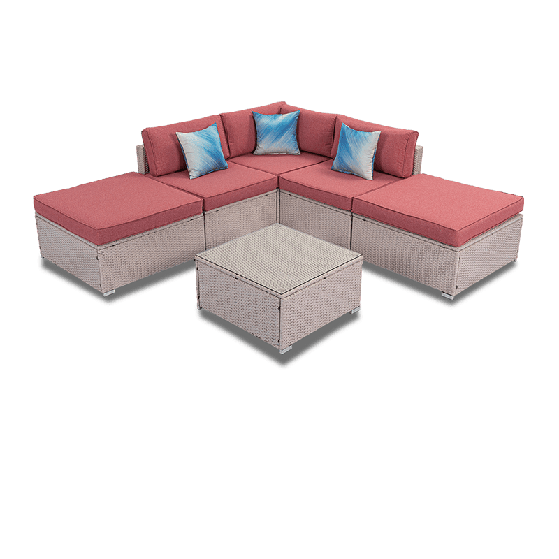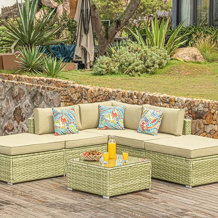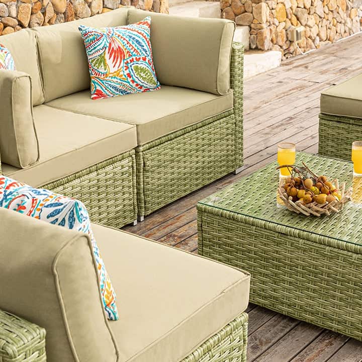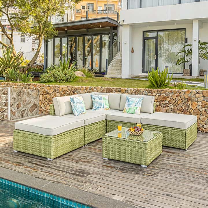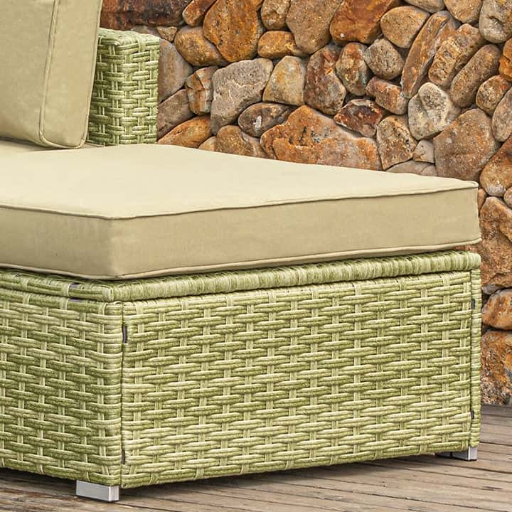 Modern patio sofa is made of high-quality PE rattan wicker and Steel frame, all-weather resistant synthetic resin. Our sectional sofa set is sturdy and durable but also lightweight at the same time. Green grass color with high quality thickened seats and cushions, giving you more extraordinary comfort and a breath of spring. According to your choice, the outdoor sofa and table set can be placed in an unlimited number of configurations.
