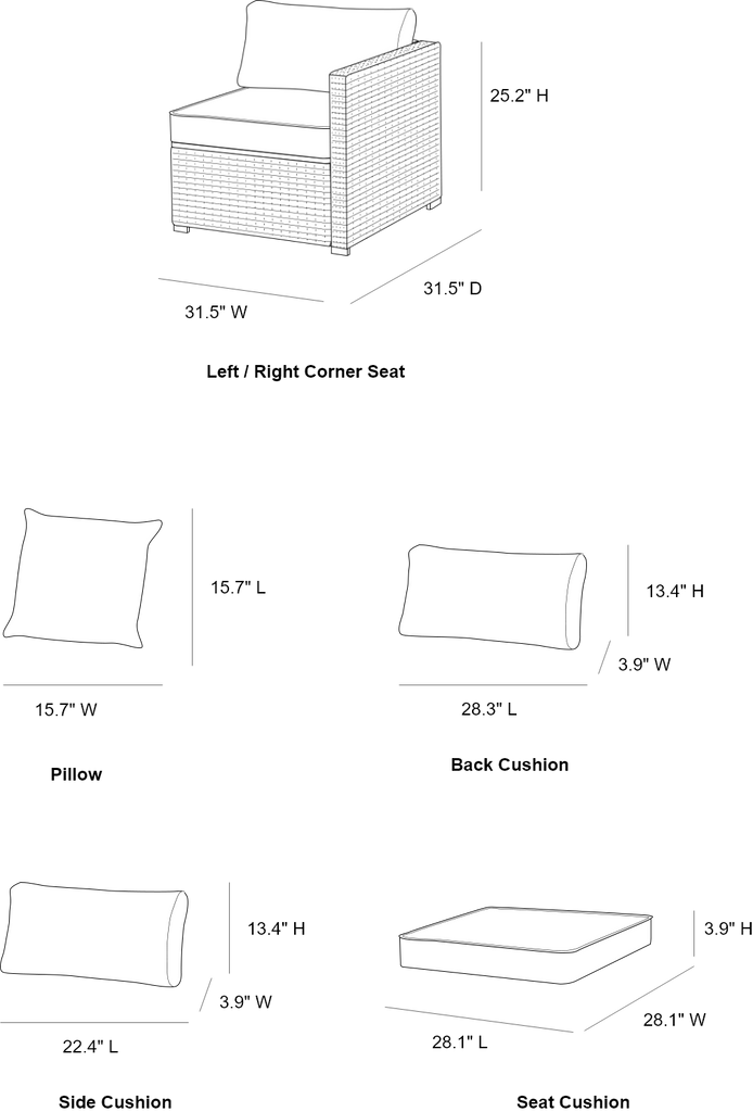 | Overall Dimensions(in.) | 31.5″ D × 63″ W × 25.2″ H | Left / Right Corner Seat(in.) | 29.3″ D × 29.3″ W × 25.2″ H |