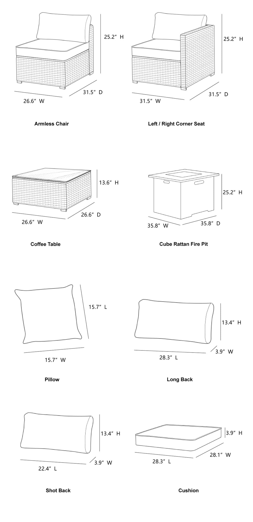 | Cube Rattan Fire Pit (in.) | 35.8″D x 35.8″W x 25.2″H |