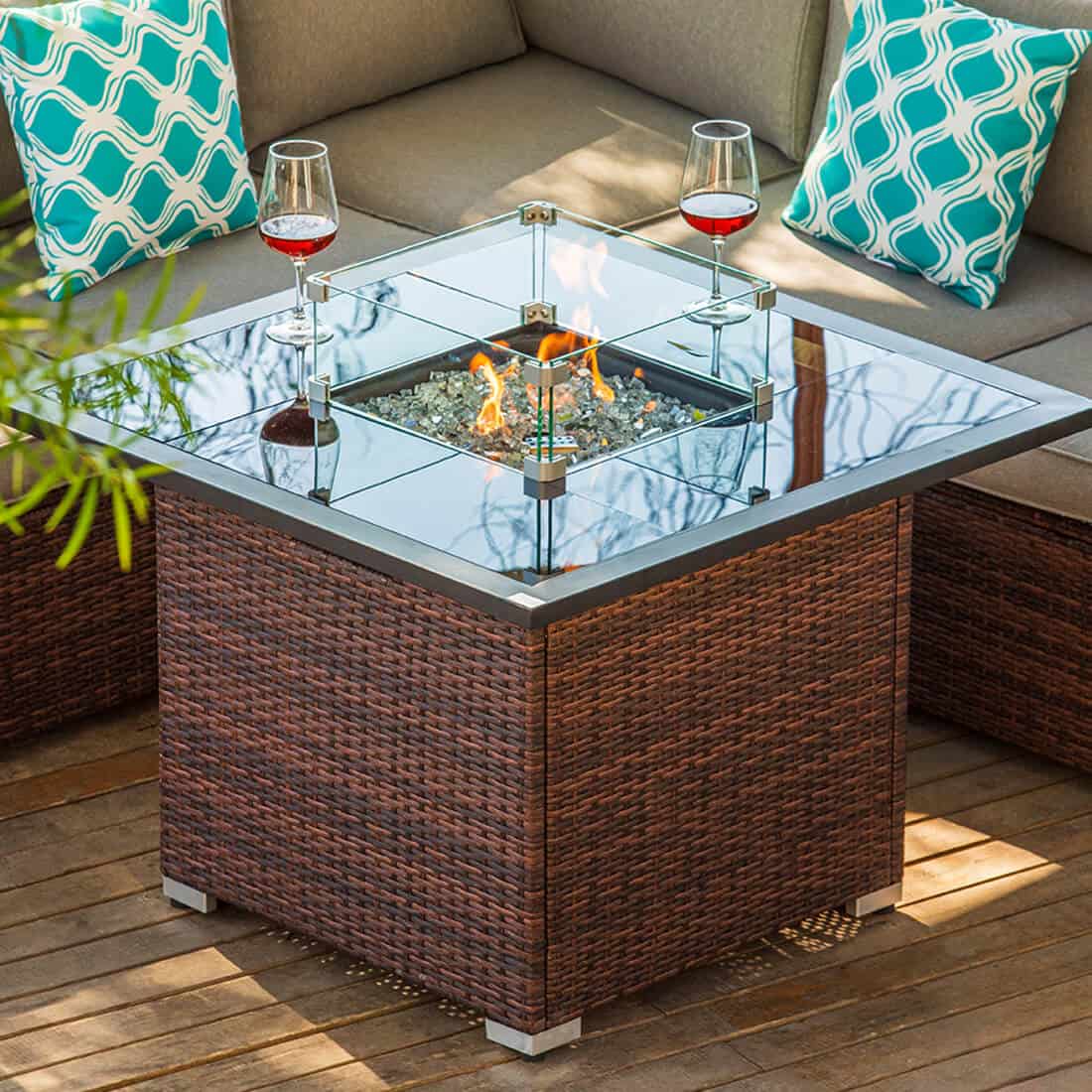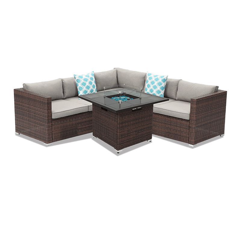 The outdoor furniture set is made of a sturdy powder-coated steel frame to ensure durability and stability. The outdoor rattan furniture equipped with very soft cushions that will make you forget your fatigue. The simple style is ideal for any garden, backyard, porch, patio, or outdoors. Balancing industrial and organic beauty, this lovely square fire table creates quite an exciting silhouette. Built-in propane tank design save more space with a clean look. Its color suits any style of patios very well.