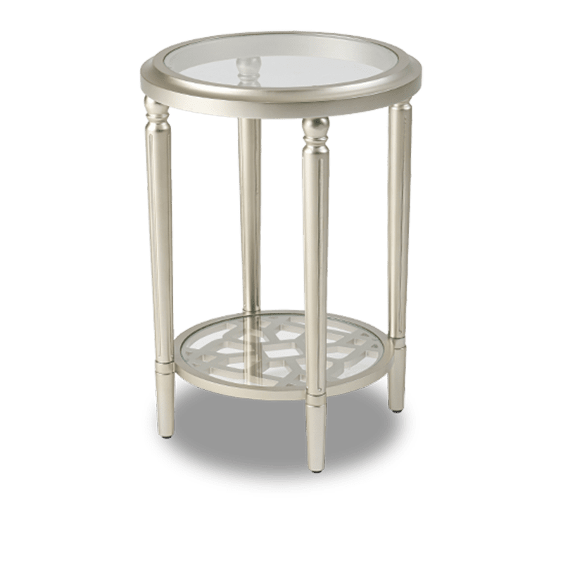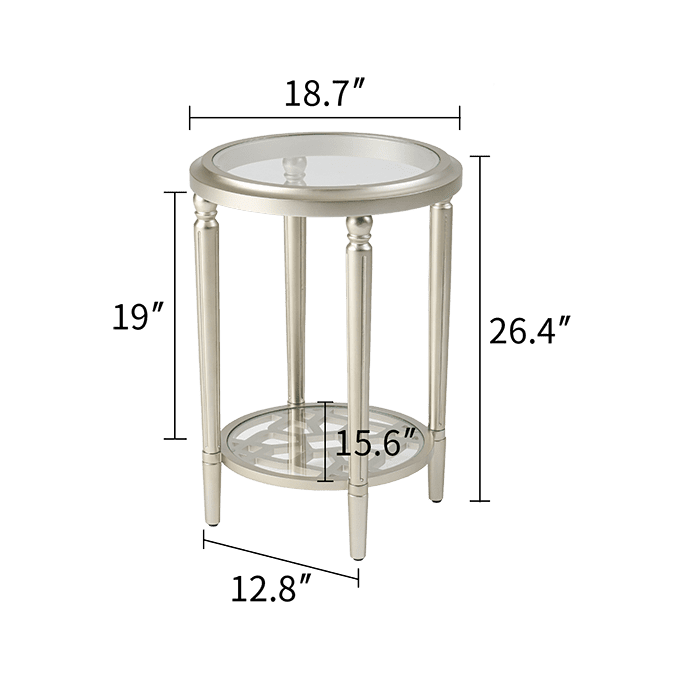 With the modern minimalism of contemporary furniture design, the elegant glass top side table surface adds further luxury to the bright champaign finish. A decorative and functional lower shelf features a floral-geometric cutout pattern and also serves to strengthen and stabilize the table’s four tapered and sculpted legs lathed from solid pine. The Eco-friendly MDF modern material keeps the glass top round side table lightweight and easily moveable and making the side table extremely versatile. Several of them coordinated with other furniture will transform any living space with a touch of elegant refinement that may even affect how your guests behave!