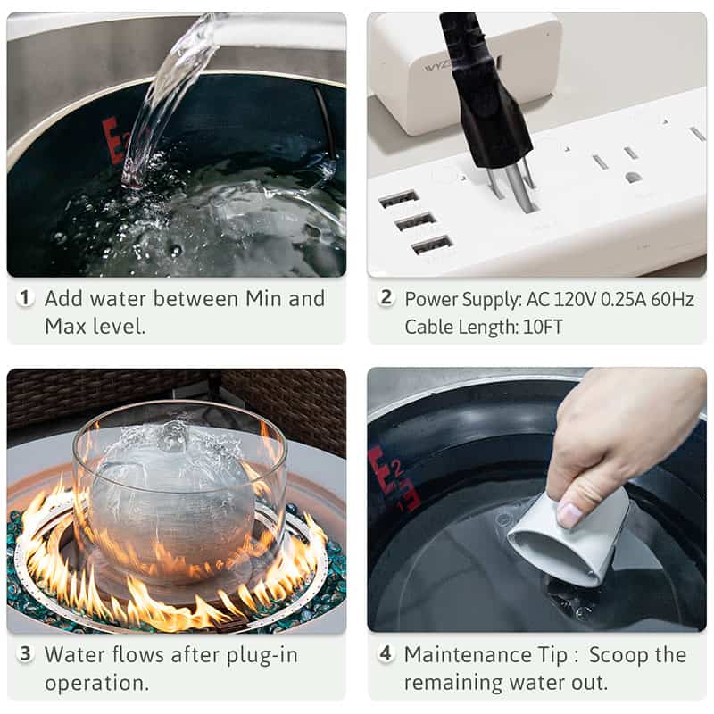 A tempered glass splash guard ensures that the flames are never doused and the water never boils away as the fountain flows from a leak-proof reservoir in the center and the fire surrounds it.