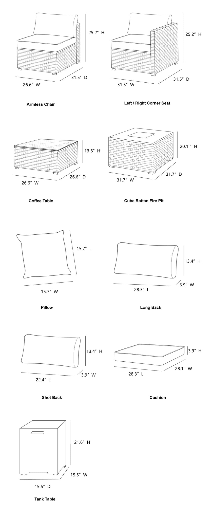 | Coffee Table(in.) | 26.6″D x 26.6″W x 13.6″H | Cube Rattan Fire Pit(in.) | 31.5″D× 31.5″ W x 20.1″H |