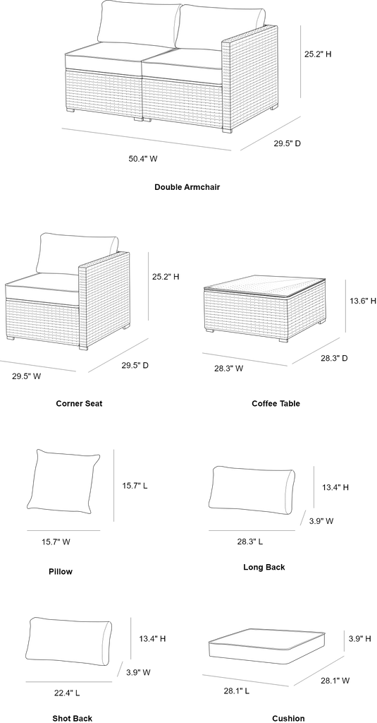 | Pillow(in.) | 15.7″ L × 15.7″ W | Left/Right Sofa Section(in.) | 29.5″ D ×50.4″ W × 25.2″ H |