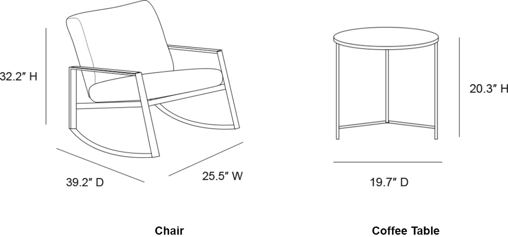 | Chair(in.) | 39.2″ D × 25.5″ W × 32.2″ H | Coffee Table(in.) | 19.7″ D × 19.7″ W × 20.3″ H |