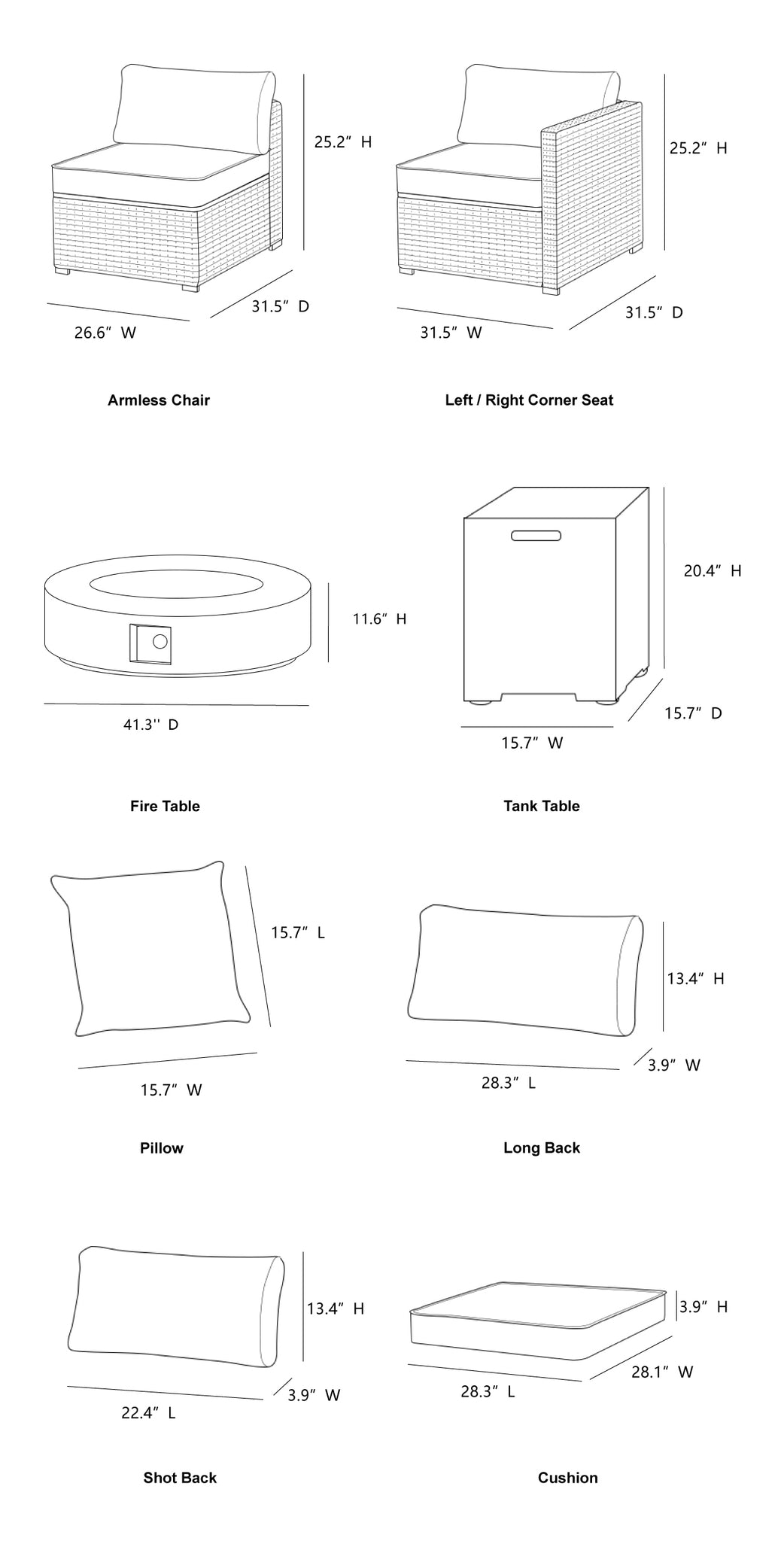 | Left / Right Corner Seat(in.) | 31.5″Dx 31.5″W x 25.2″H | Armless Chair(in.) | 31.5″.D× 26.6″ W x 25.5″H |