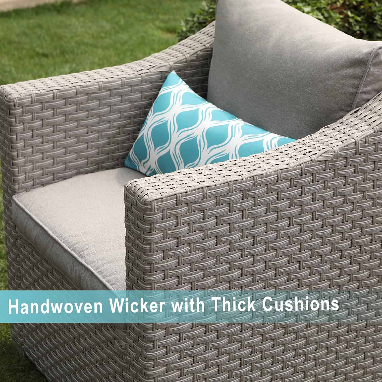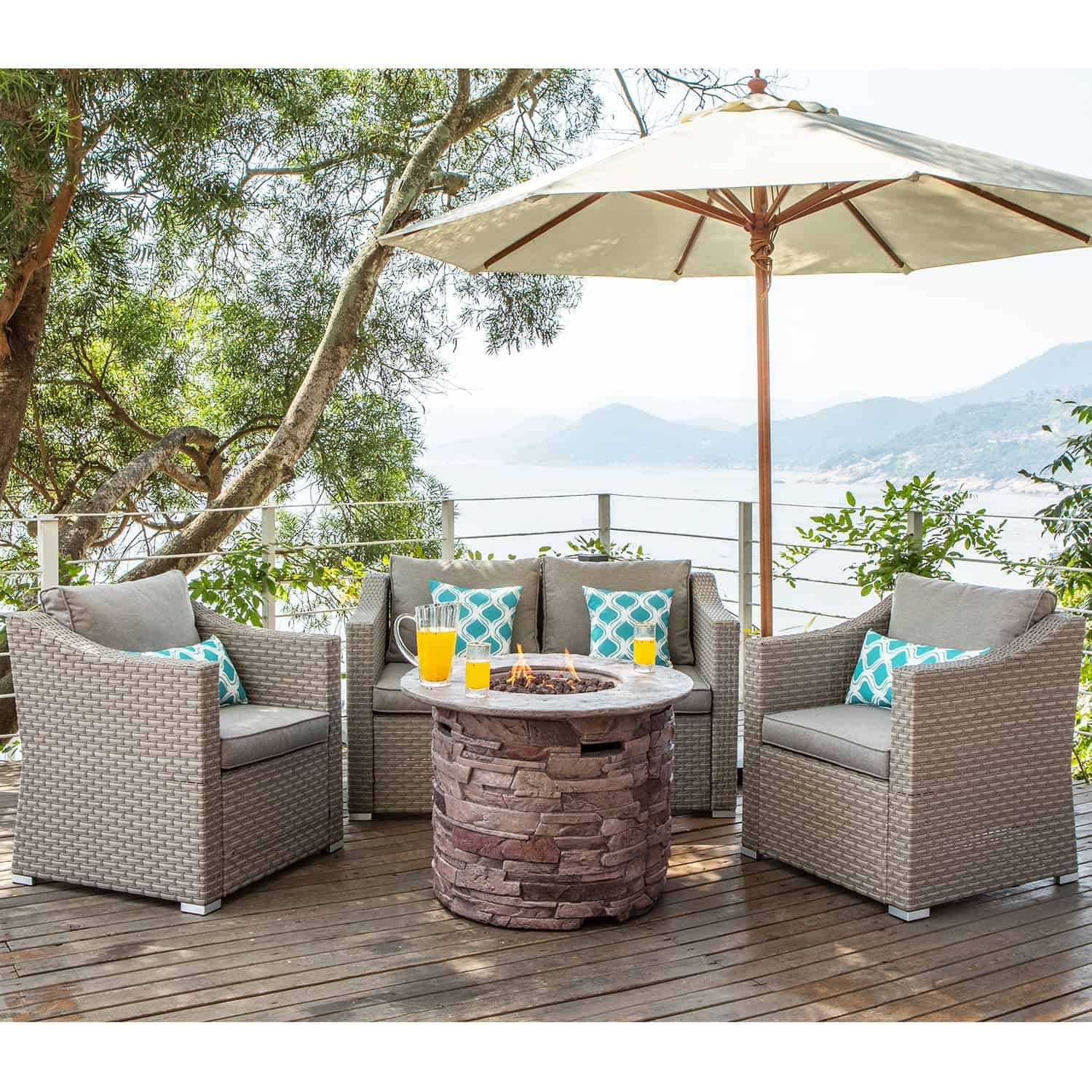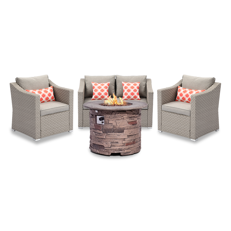 Outdoor comfort never looked so good! The comfort is elevated by 4-inch thick high-density foam seat and back cushions and four cute teal pattern pillows. All cushions and pillow covers are made with our superior poly-fiber fabric. The coating is embedded right into the steel with high temperatures which is durable and built for the outdoors. The faux brown ledgestone round base fire table made by fire retardant magnesium oxide with a stainless steel burner bowl. Clean burning propane flame provides soothing warmt and a centerpiece for outdoor evenings worth remembering. The table base conceals an ordinary 20-gallon propane tank storage and the push of a button and flame intensity is controlled by the turn of a knob. Natural red lava pieces fill the burner bowl and help radiate warmth more evenly as they are heated by the flames. No smoking with burning which is better for the environment. The Firepit table also comes with a waterproof cover to keep it clean and dry when not in use.