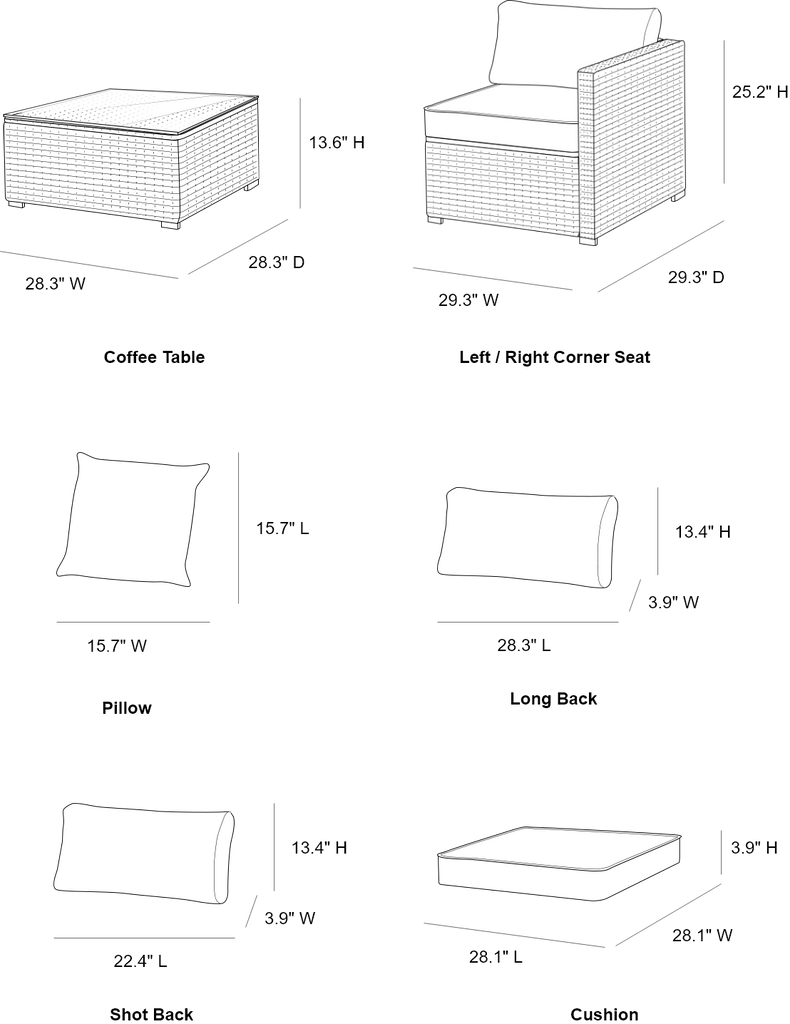 Seat Cushion(in.) 28.1″ L × 28.1″ W × 3.9″ H Back Cushion(in.) 28.3” L × 3.9″ W × 13.4″ H