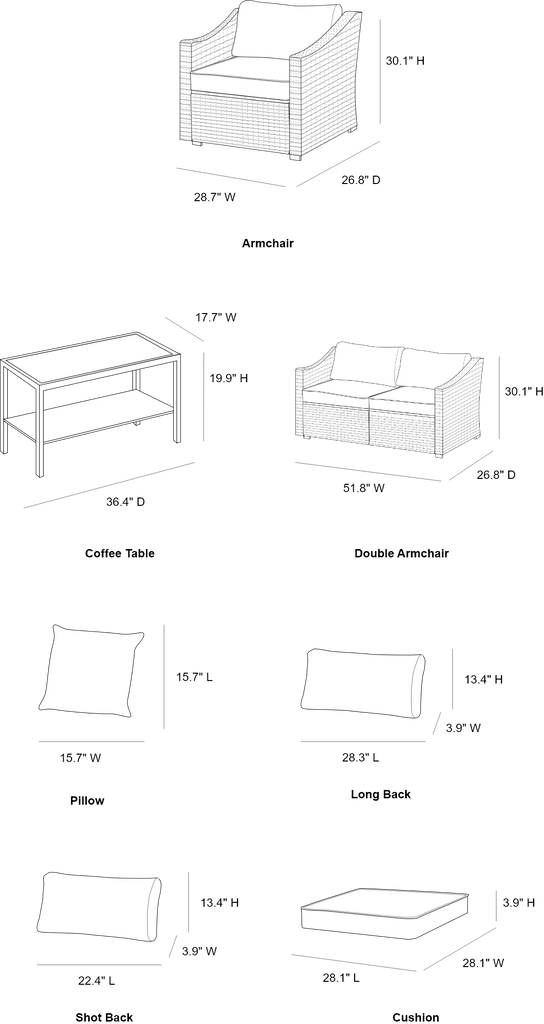 | Single Chair(in.) | 26.8″ D × 28.7″ W × 30.1″ H | Loveseat(in.) | 26.8″ D × 51.8″ W × 30.1″ H |