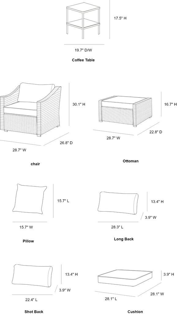 | Single Chair(in.) | 26.8″ D × 28.7″ W × 30.1″ H | Seat Cushion(in.) | 24.0″ L × 21.5″ W × 3.1″ H |