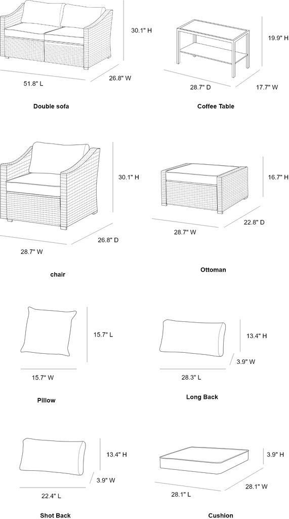 | Loveseat(in.) | 26.8″ D × 51.8″ W × 30.1″ H | Single Chair(in.) | 26.8″ D × 28.7″ W × 30.1″ H |