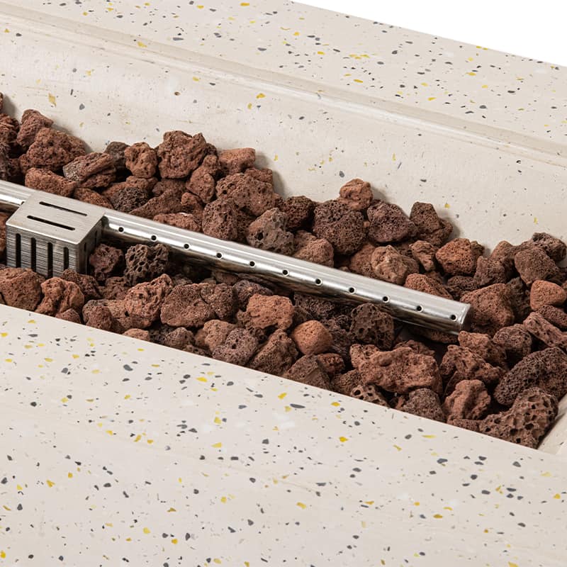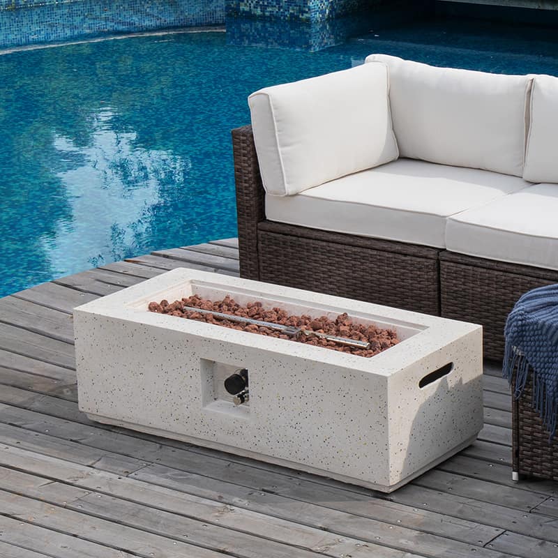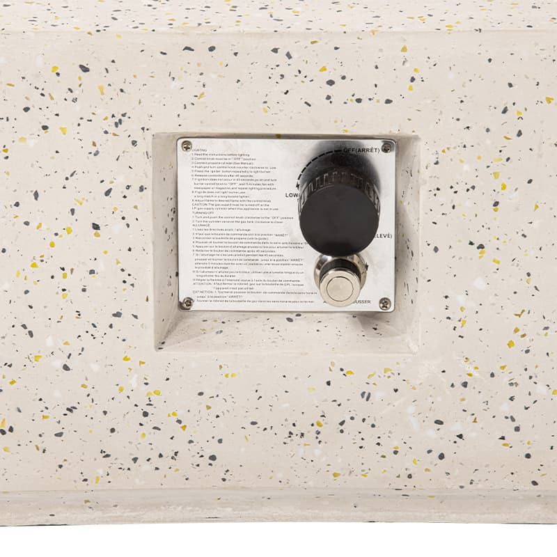 Terrazzo is a special craftsmanship. Its history can be traced back to ancient mosaics in Egypt, and it originates in Italy. Glass and granite are mixed with MgO Composite. After solidification, the surface will be ground and polished. They are like gems inlaid on the surface of fire pit. Its clean and neat color suits for all kinds of patios with different styles. Propane fire pit table makes for the ideal outdoor centerpiece and easy to move. The whole set is a good view of the patio.